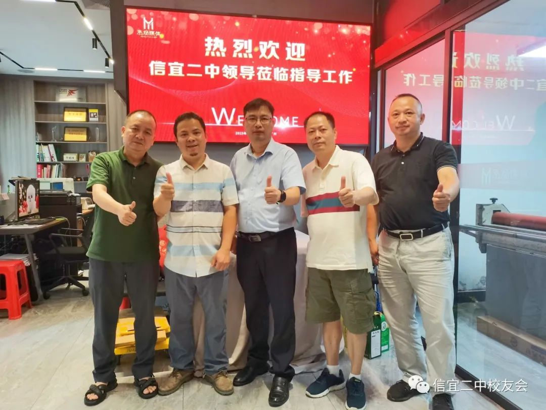 2023年7月7日下午,信宜二中校友联络组成员副校长陈立福携手信宜二中广州校友叶敏、杨勇和刘晓冰一同拜访了99届高中校友冼荣洪的企业——广州泓扬媒体广告有限公司。